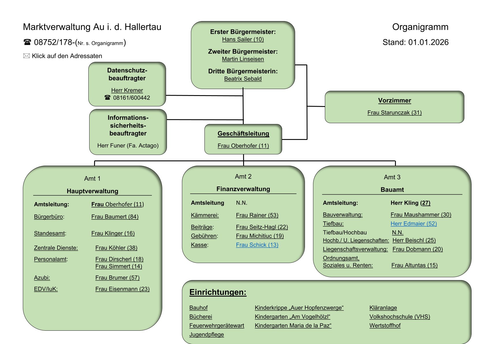 Die Kontaktdaten der Ämter bzw. Sachgebiete und der Einrichtungen finden Sie im